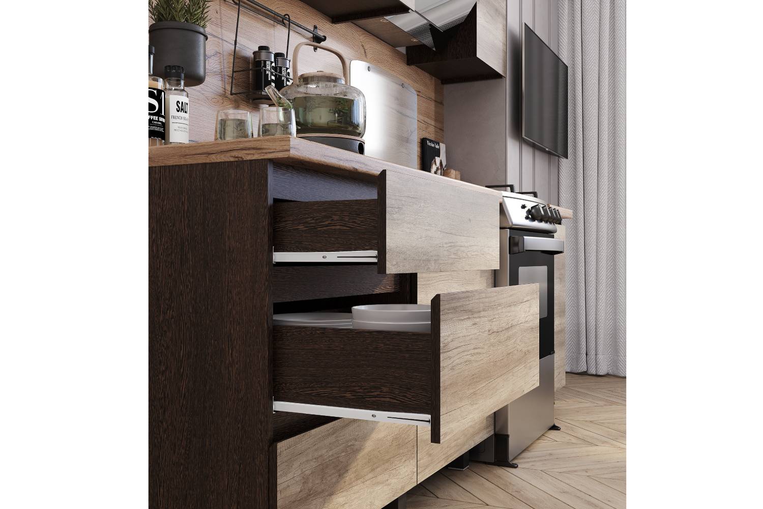 Кухня Энигма 1,6 м от фабрики БТС МЕБЕЛЬ – это современное решение для вашей кухни, выполненное в стильном дизайне с интегрированными срезами на фасадах. Благодаря натуральным оттенкам "дуб каньон" и "венге", гарнитур выглядит как из настоящего дерева. Износостойкие материалы и высококачественная фурнитура обеспечивают долговечность и надежность. Столешница толщиной 38 мм, роликовые направляющие и максимальная нагрузка на ящик до 5 кг делают этот комплект практичным и удобным. Модульный состав включает навесные и напольные шкафы, что позволяет создать индивидуальную планировку кухни. Гарантия на продукцию составляет 24 месяца.